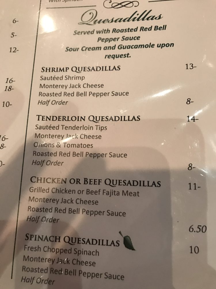 Flour Tortillas stuffed with Spinach, & Melted Monterey Jack, with Roasted Red Bell Pepper Sauce. Sour Cream & Guacamole on Request